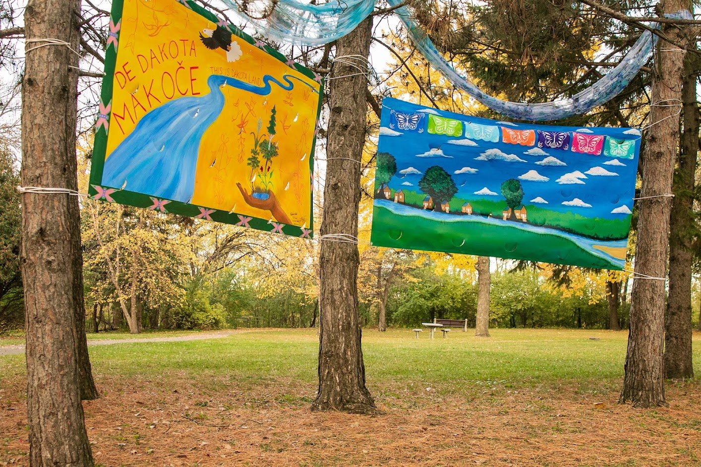 A yellow mural, with a green border and pink geometric Dakota butterfly designs framing it, is suspended between two red pine trees. A body of water snakes from the top right to the bottom left of the artwork, with the phrase De Dakota Makoče (This is Dakota Land) written alongside it. An eagle is depicted in flight above the water, and in the right portion of the artwork, an outstretched hand cups a corn plant, a cedar tree, roses, wild rice, elderberry, plums, sage, sweetgrass and other traditional plant medicines as if the plants themselves are growing out of the hand. (Artists for this piece include Miiskogihmiimwan Poupart Chapman, Madison Hand, Mishaila Bowman, Keeli Siyaka, Mesa Laroque, and Naveah Balderrama)
